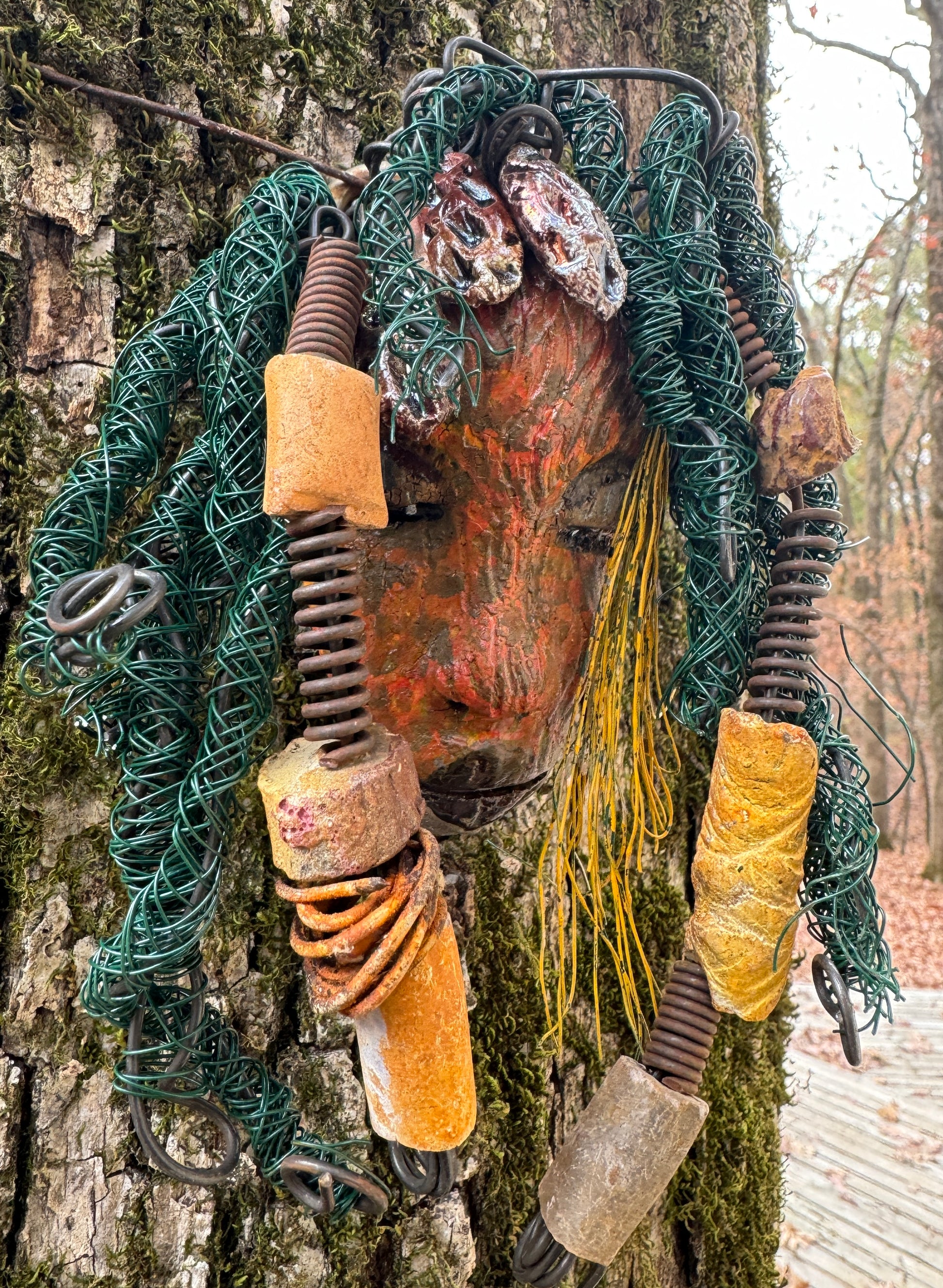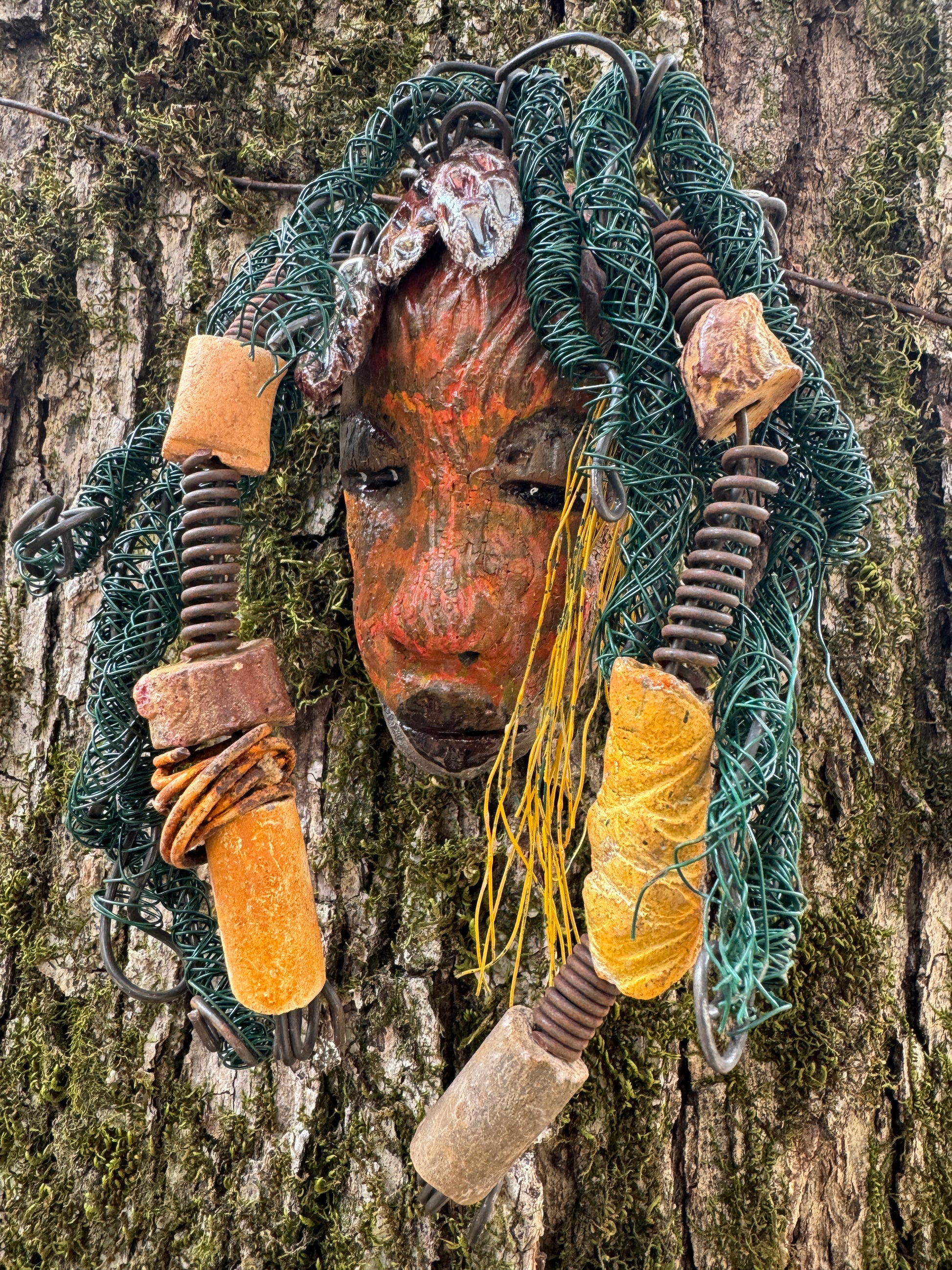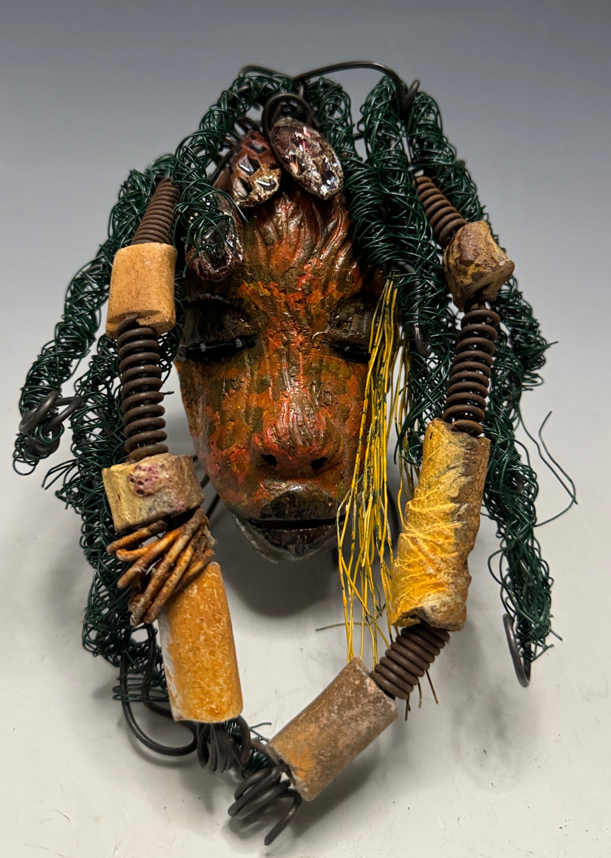 Paul stands out - whether alone in a shadow box, outdoors mounted on a tree, or in any other setting. He is a 5” x 7” handcrafted Raku fire mask. Constructed of clay and wire, Paul is decorated with 15 feet of 16/24 gauge wire for hair. His speckled honey-brown complexion adds a unique beauty, making him the perfect present for the holidays.
