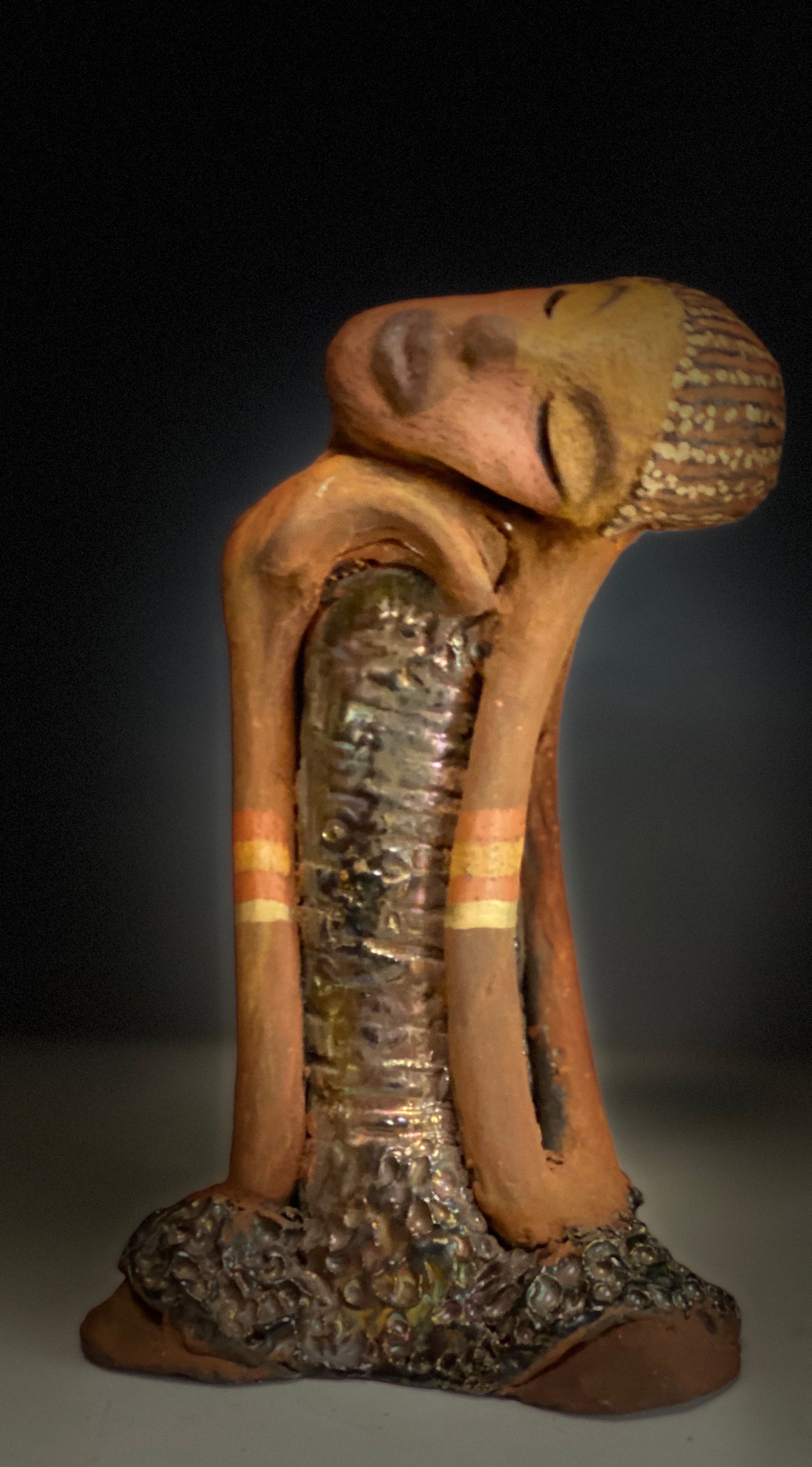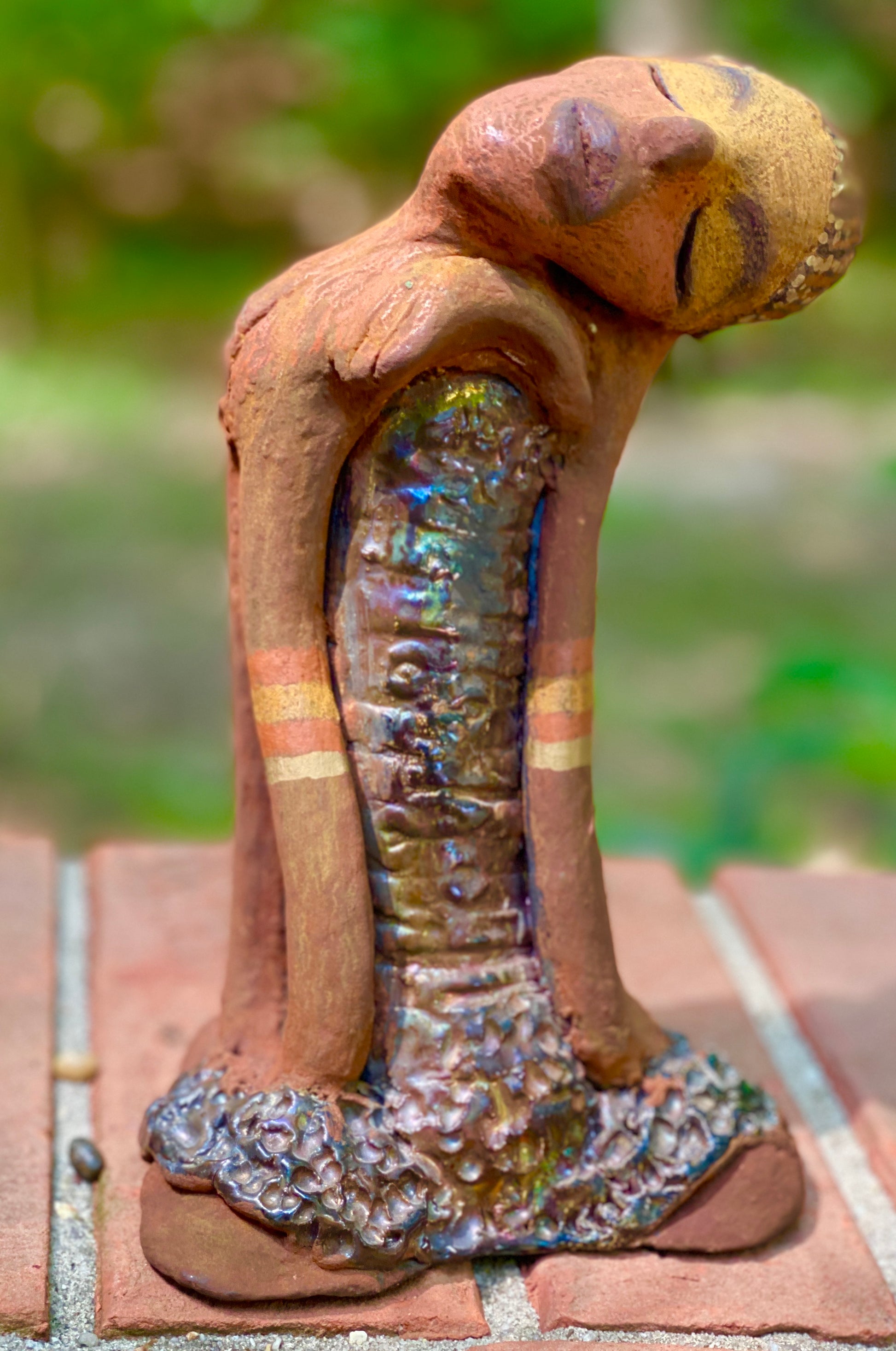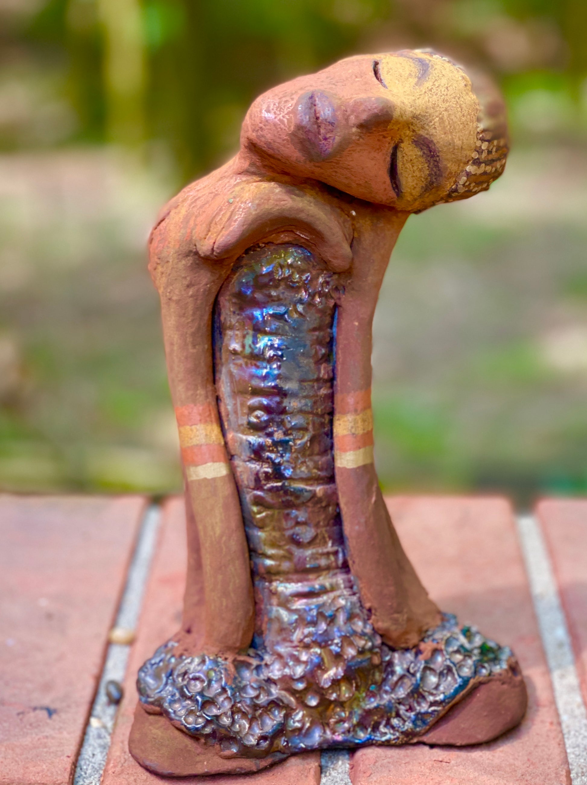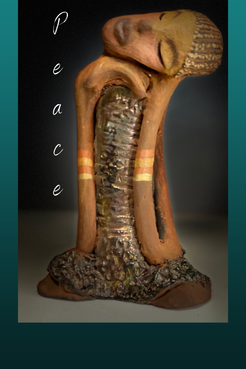 Standing 9" x 5" x 4", the recently updated Peace weighs 2.01 lbs. Featuring a glossy textured metallic dress, two-tone honey brown complexion, tilted shoulder and long loving arms, Peace is a charming piece to admire. Adorned with braids and two tribal armbands, Peace presents a sense of comfort and relaxation. Have any questions?