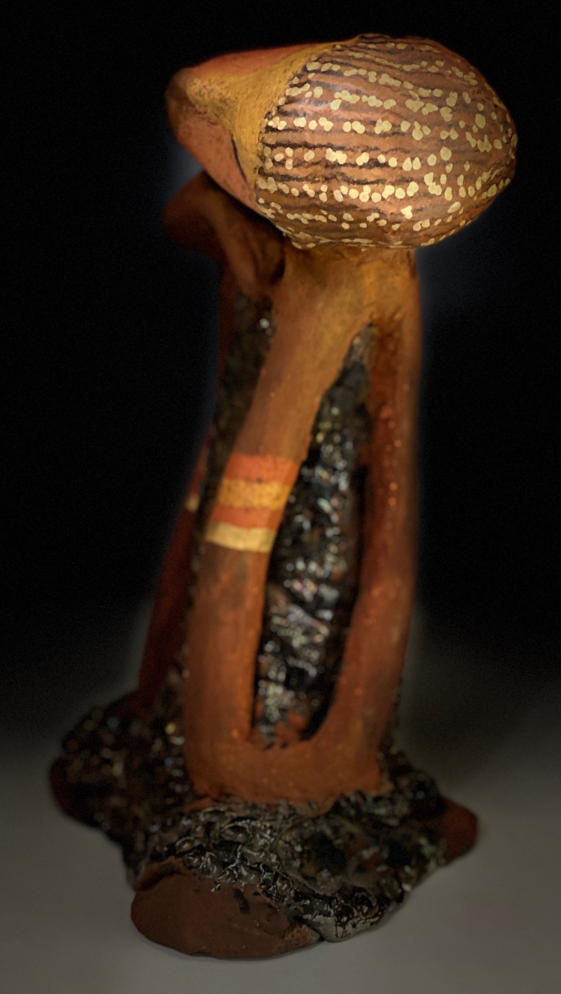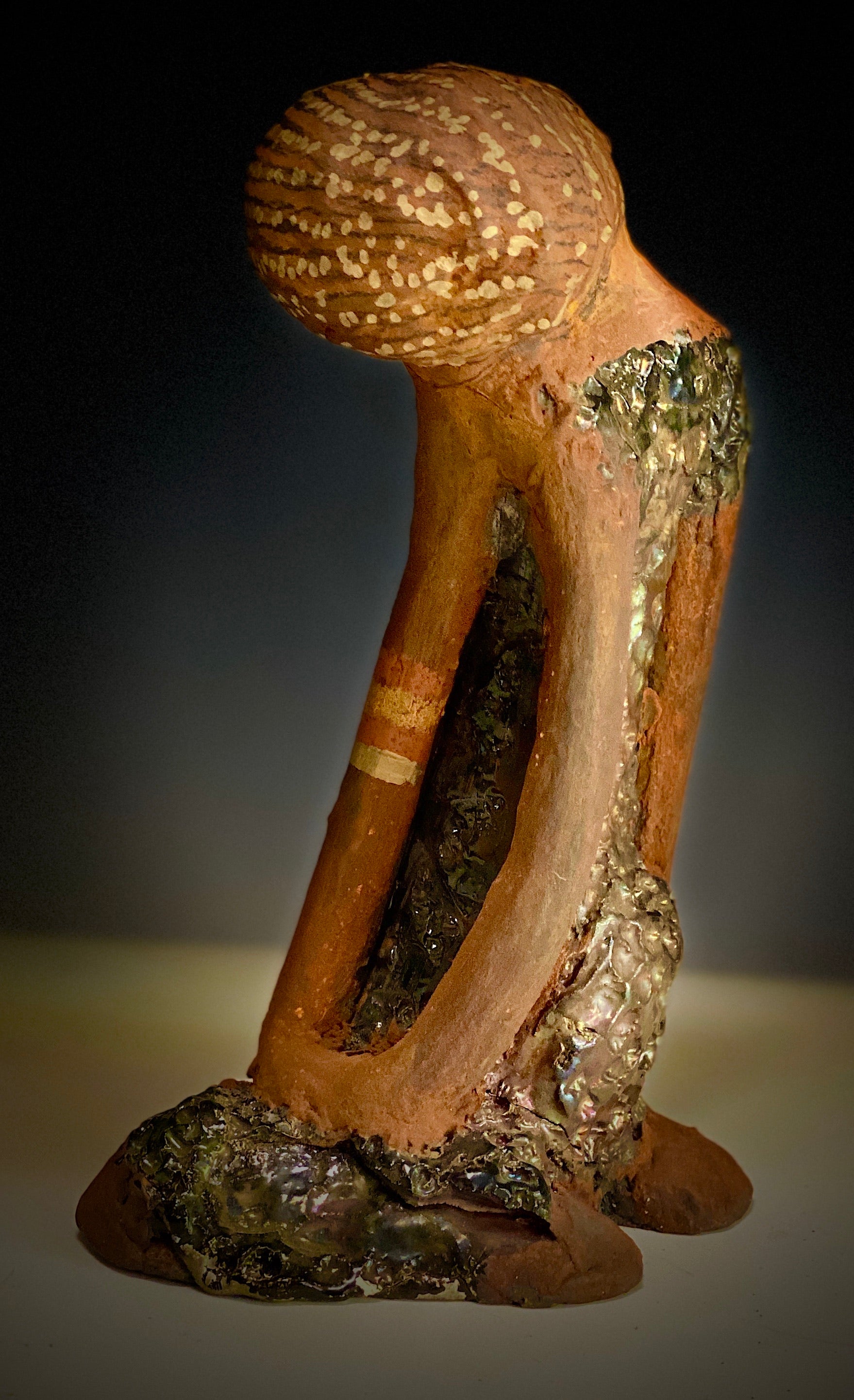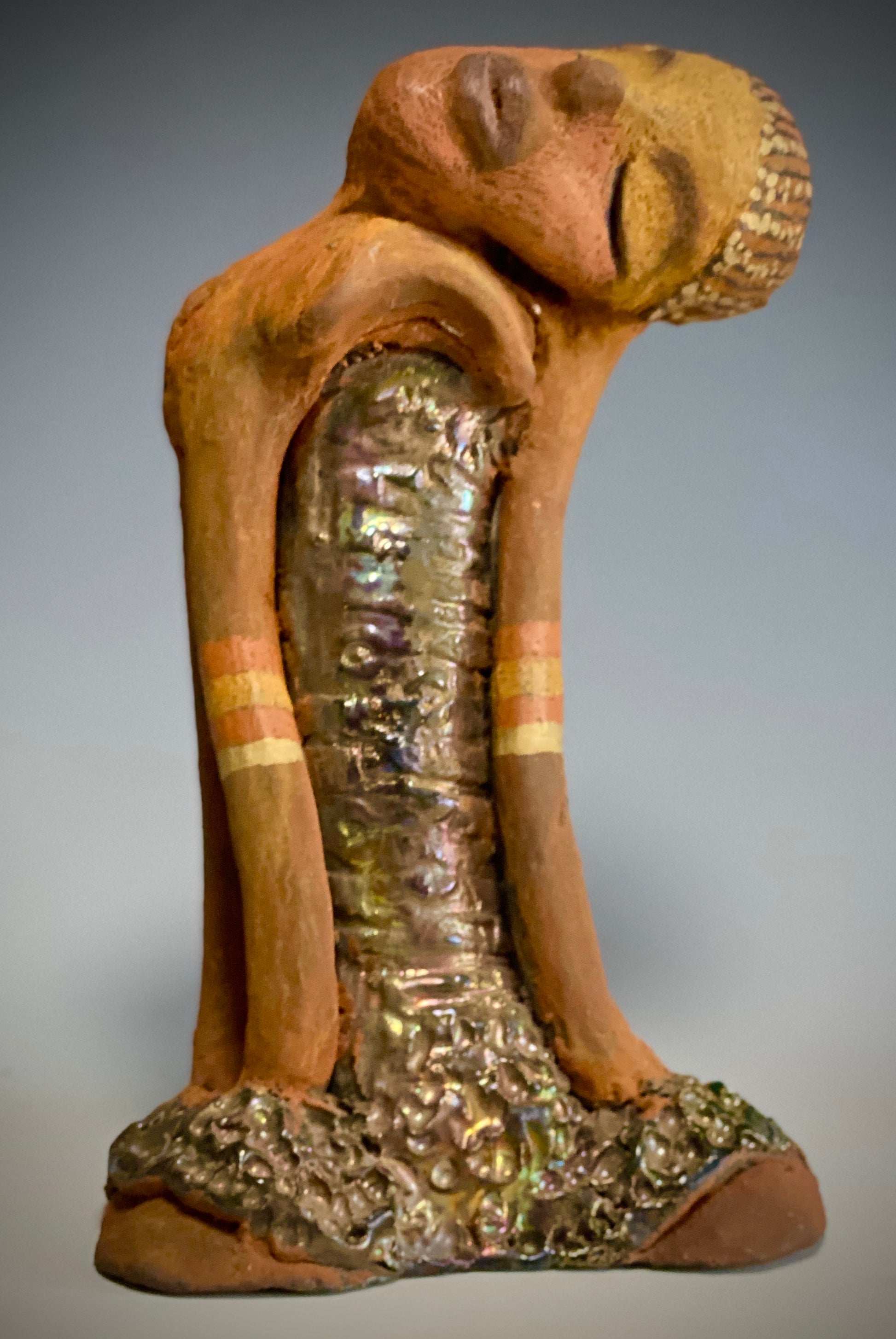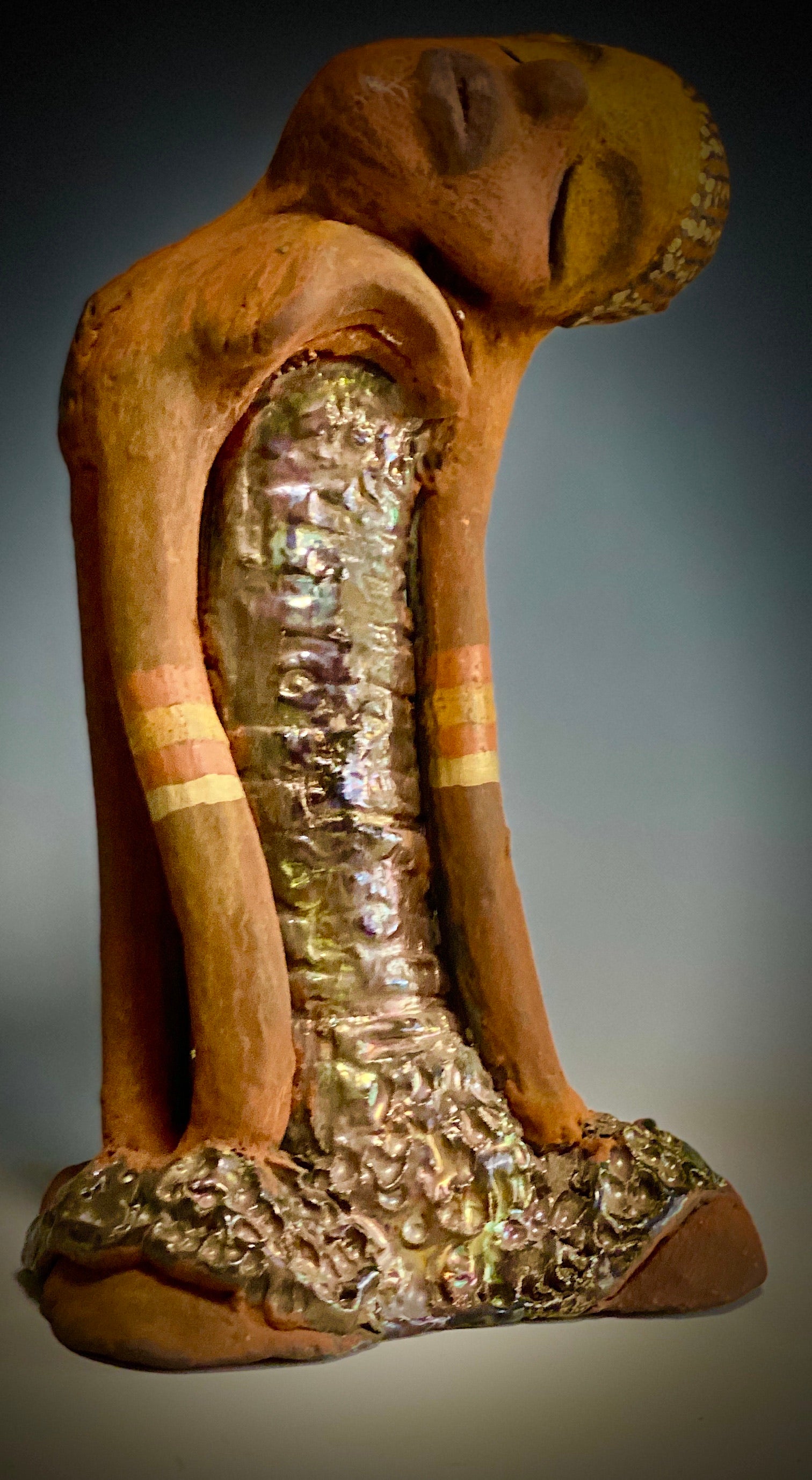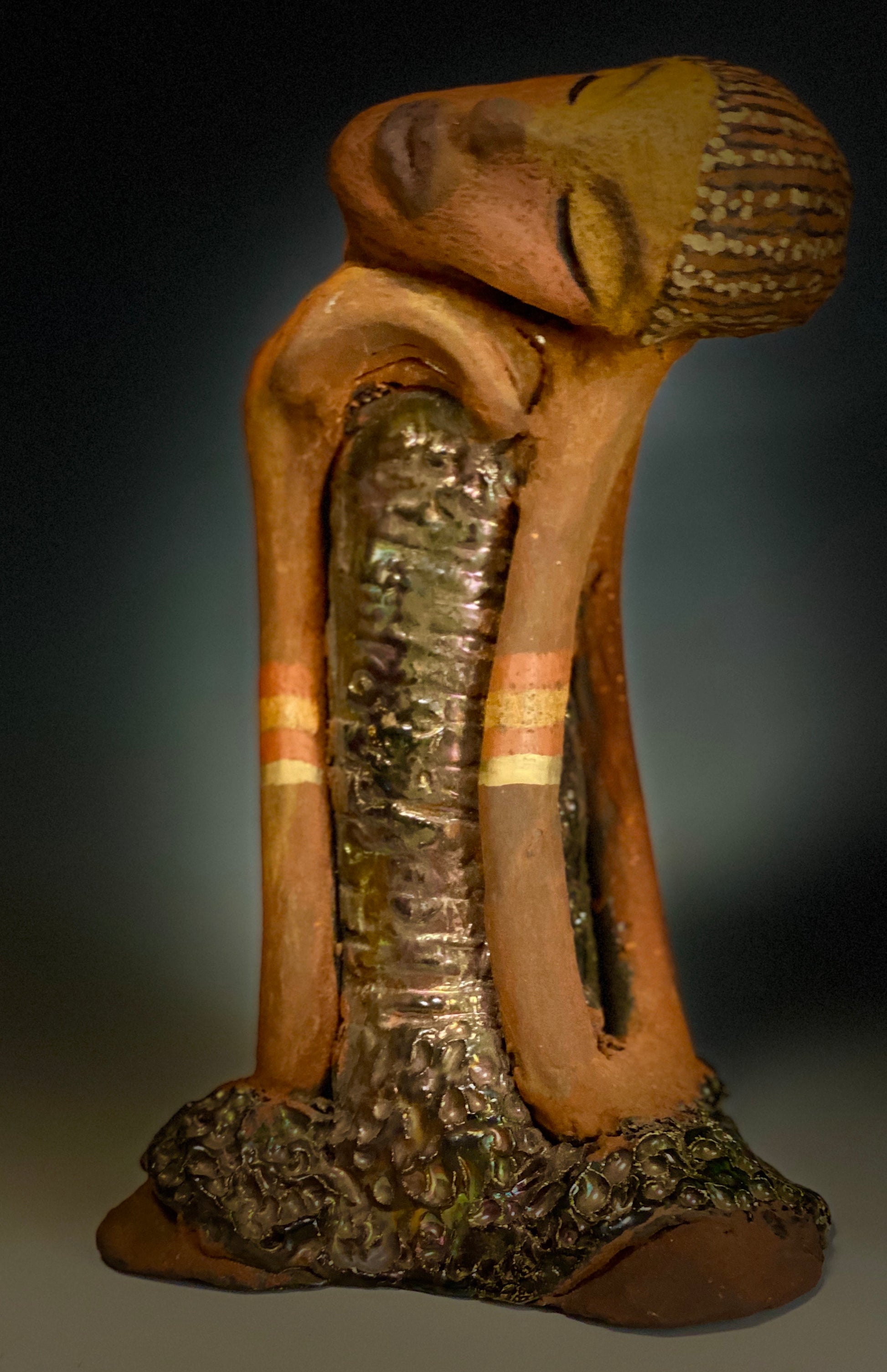 Standing 9" x 5" x 4", the recently updated Peace weighs 2.01 lbs. Featuring a glossy textured metallic dress, two-tone honey brown complexion, tilted shoulder and long loving arms, Peace is a charming piece to admire. Adorned with braids and two tribal armbands, Peace presents a sense of comfort and relaxation. Have any questions?