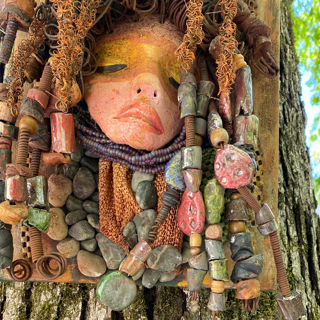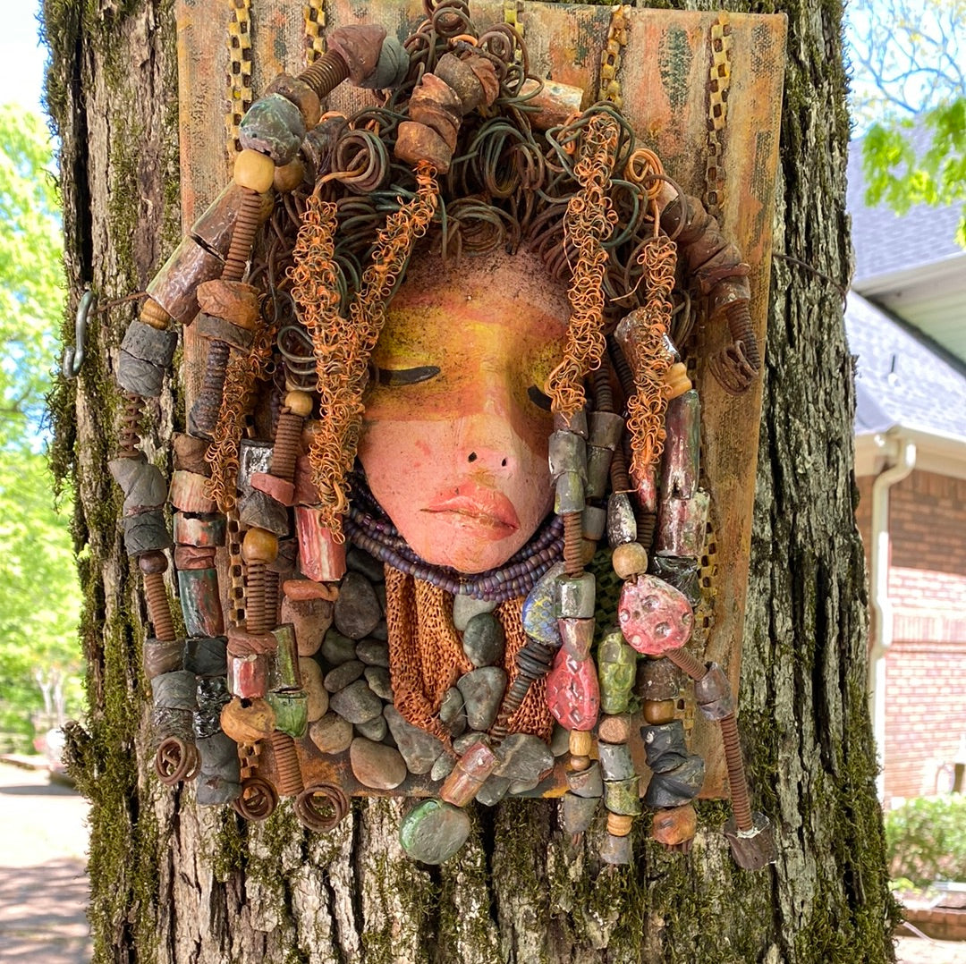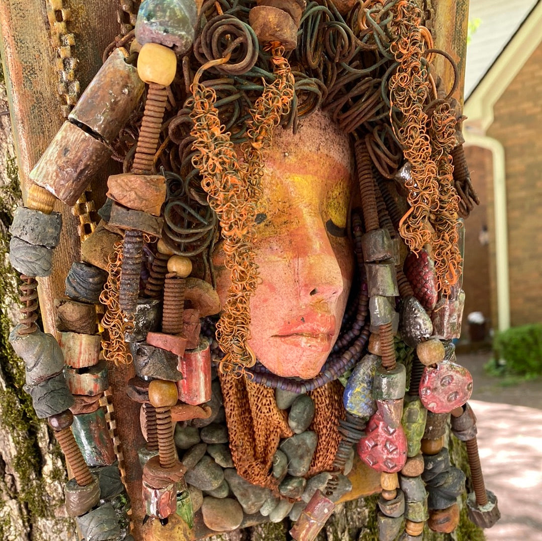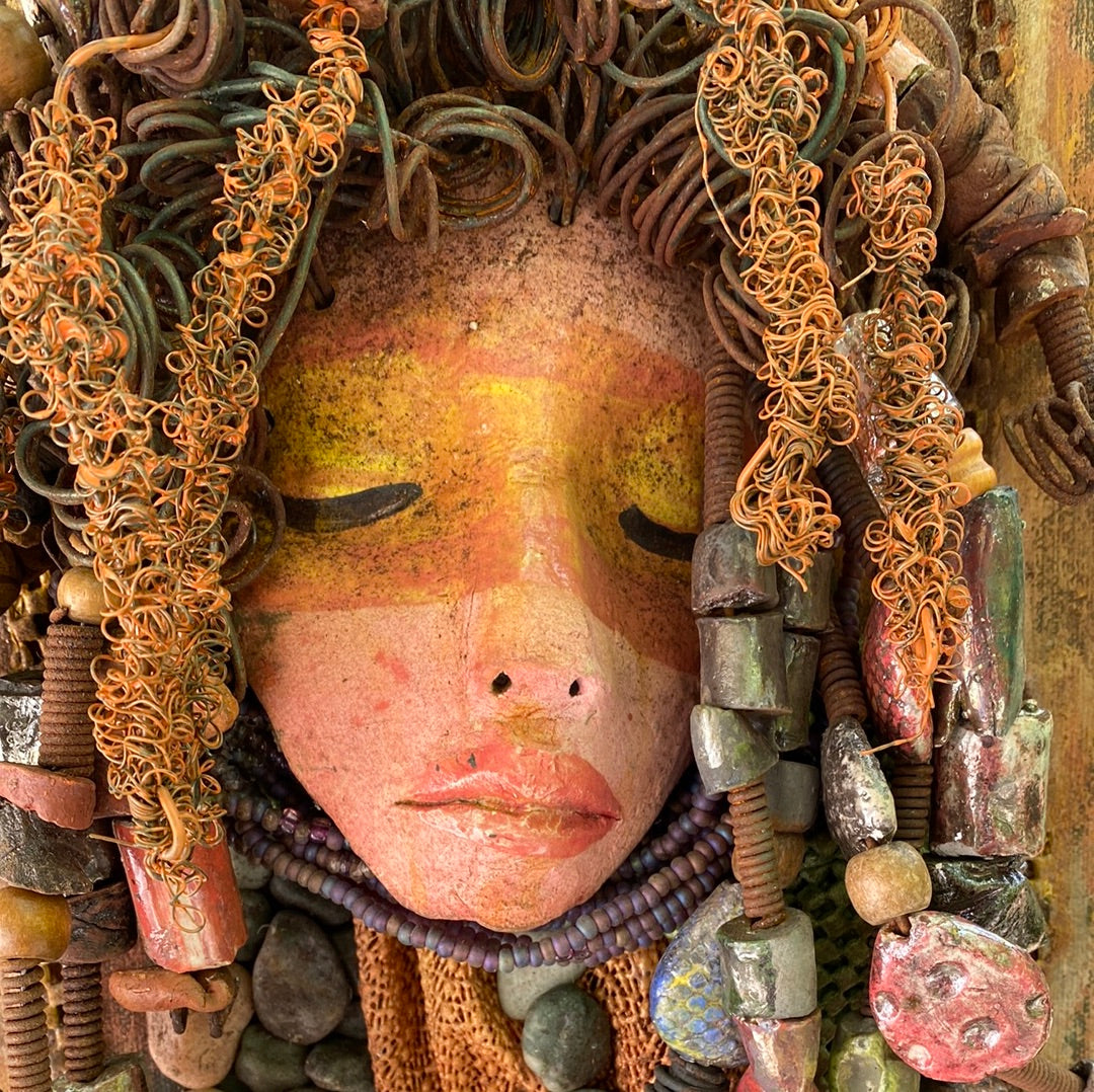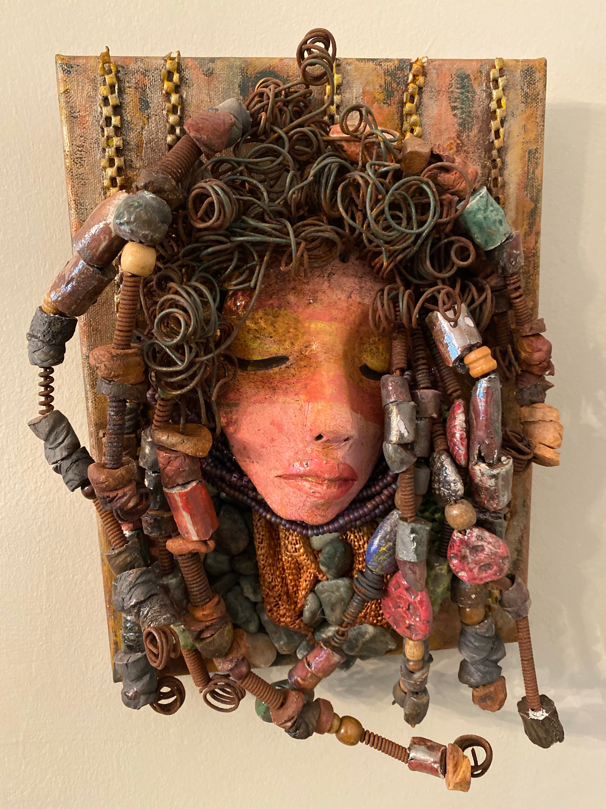 I was inspired to create Petra upon visiting the Smithsonian Museum of African Art, where I saw authentic African artwork. I spent many hours diligently crafting Petra, resulting in a 9" x 12" painted canvas mask with over 40 feet of 16 gauge wire for hair and more than 50 raku beads. Her face features a rust brown and amber crackle design, with rust brown lips. Petra is now ready to be hung.