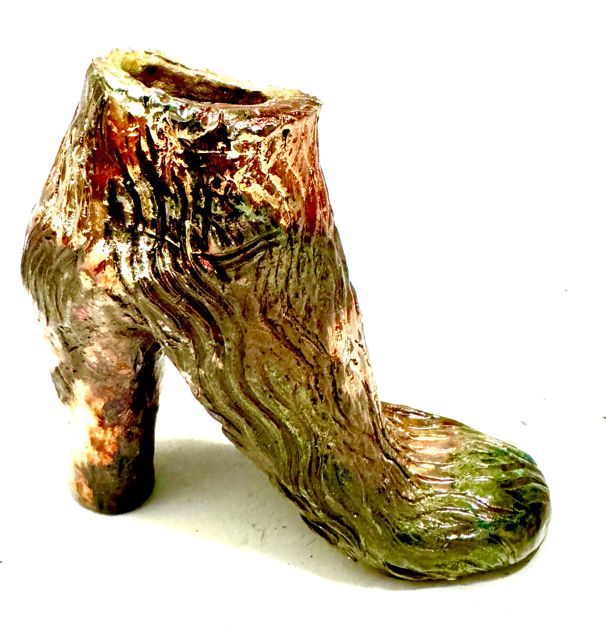 This Planter Boot-2 measures 5"x2.5"x4" and weighs just 7.2 oz. It is crafted from unique Raku ceramic and features an eye-catching texture and copper glaze. An excellent gift for those with a love of artsy, stylish ceramic boots.