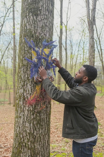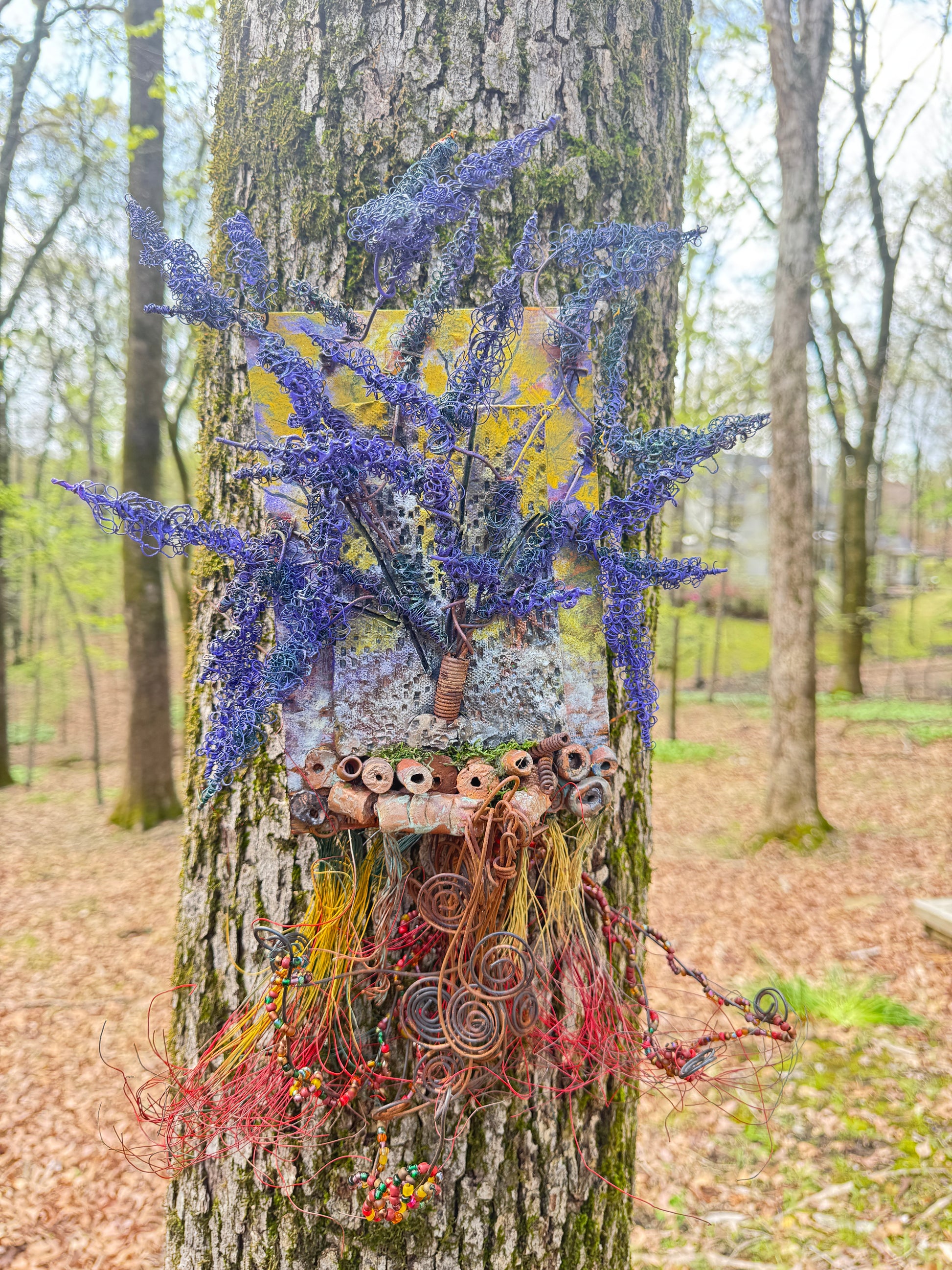 Experience the whimsical world of Purple Dusk with this mixed media landscape. Measuring 20"x16", it combines 16- and 24-gauge wire with handmade Raku fire beads, and even includes a RAKU fired and hand painted texture tile on a 7"x5" wood base. Let the sun peek through the vibrant purple dusk leaves and transport you to a lazy warm summer day.