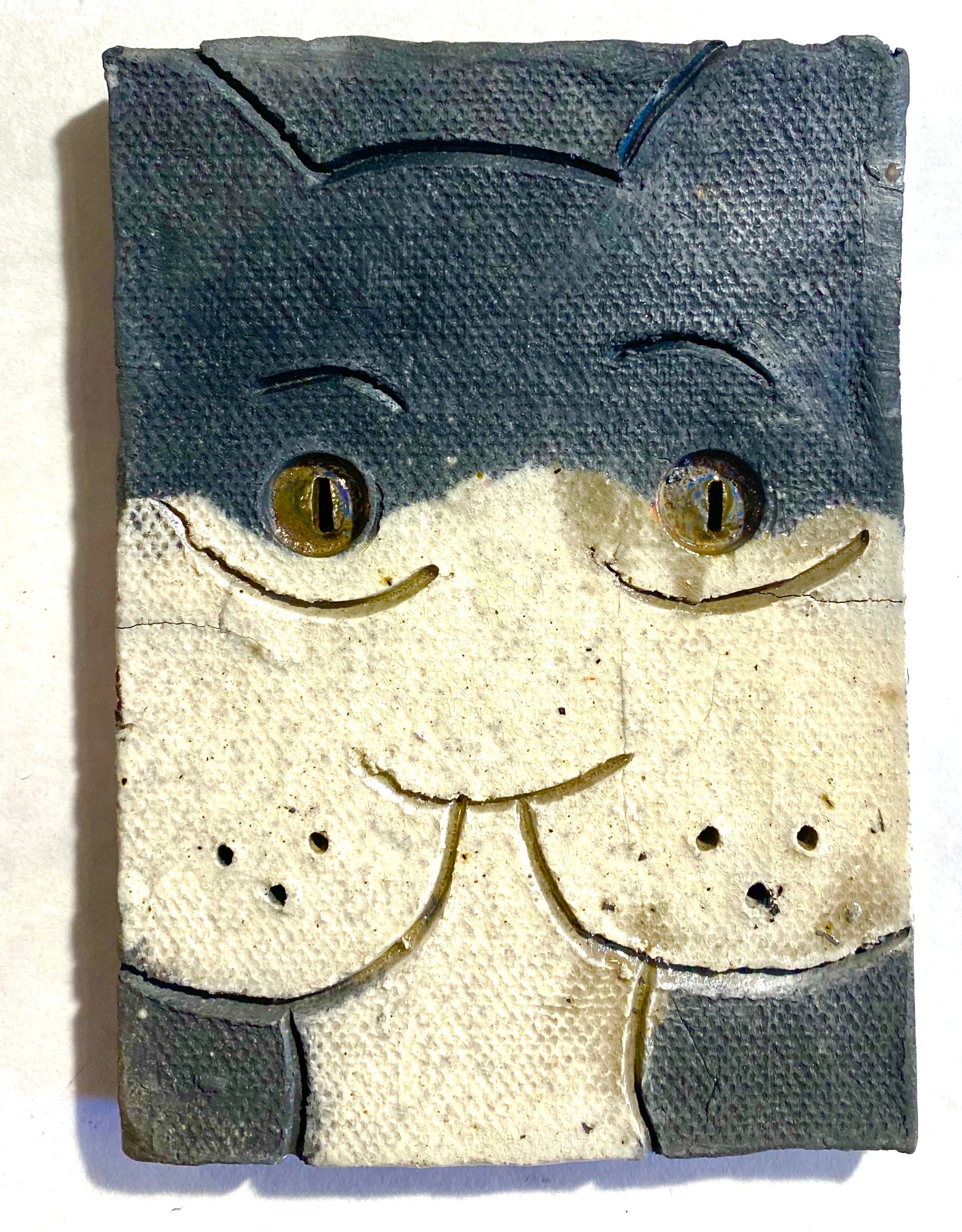 This Cat Face Tile is Raku Fired and measures 3.50" x 5", weighing 6 ozs. It comes with a back hook and if you have any questions, you can message or chat with us for more information. Shipping and returns policies can also be found on our website.
