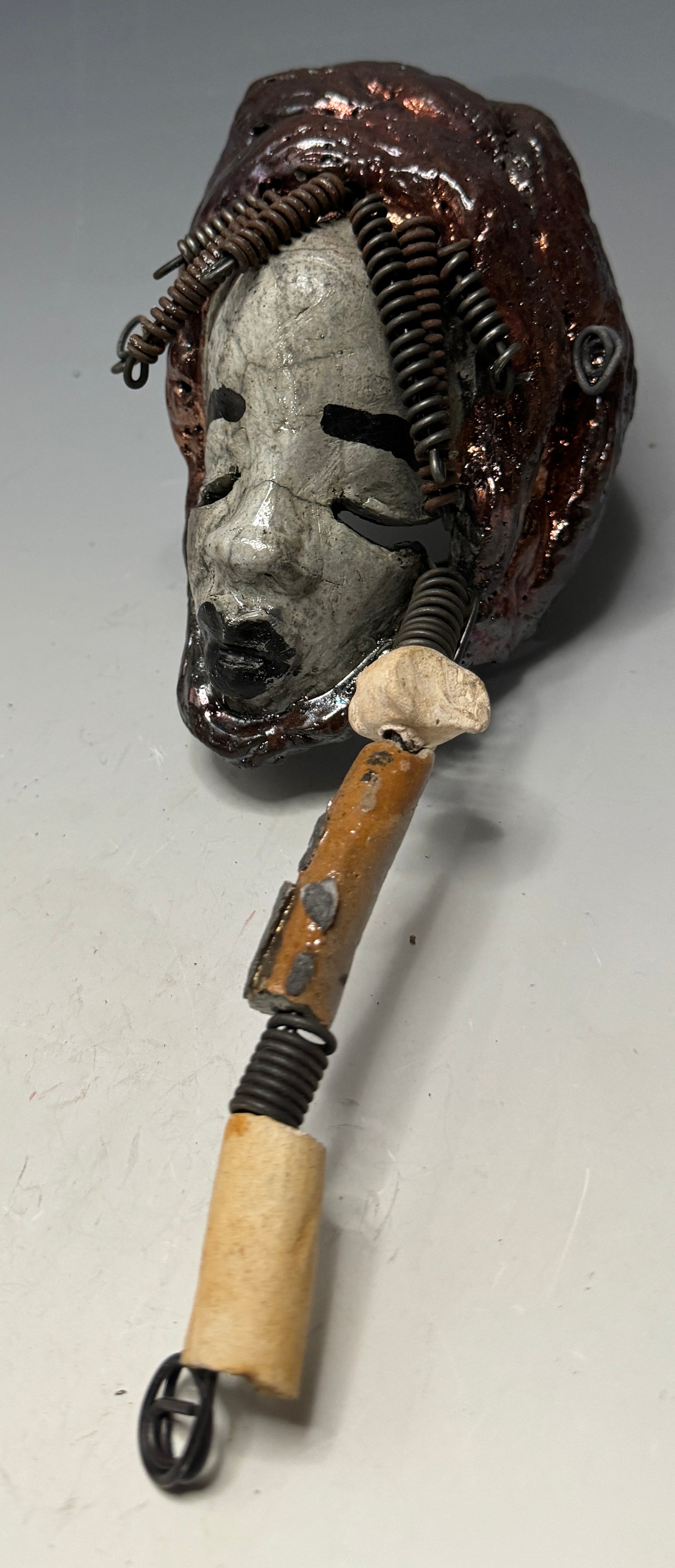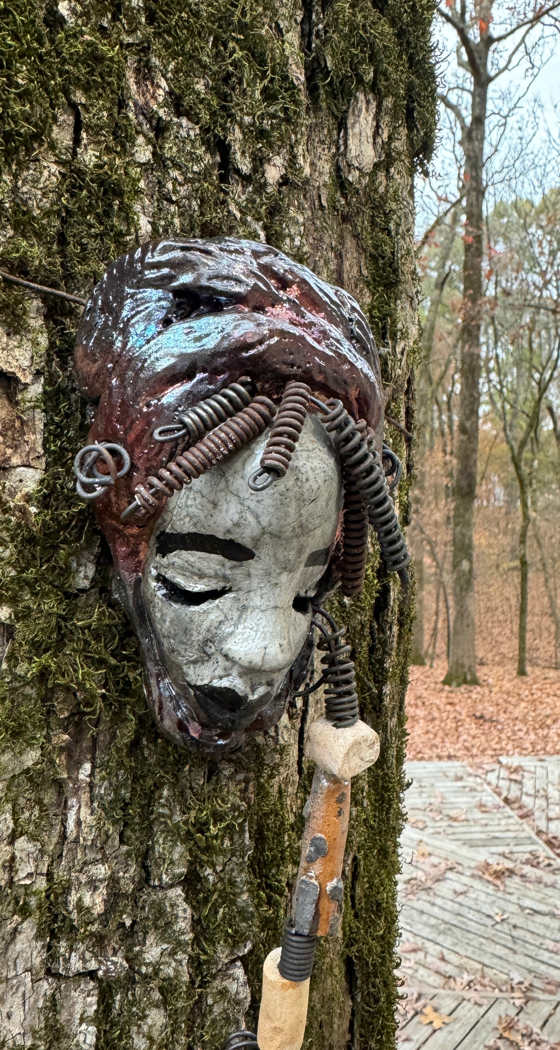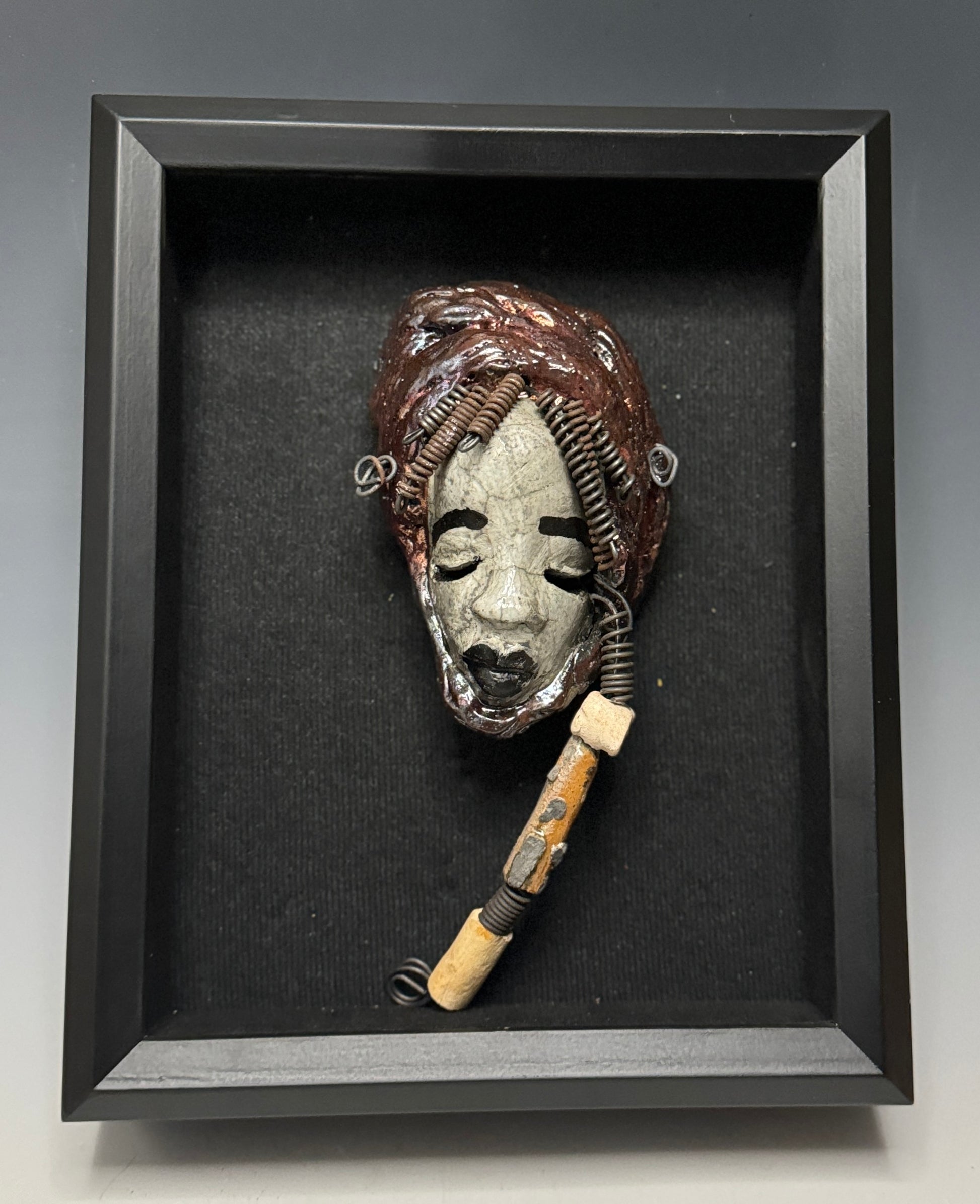 Rickie J is a 4x 9” raku-fired mask featuring a pristine off-white color palette. His intricately detailed hair is composed of nearly 15 feet of 16 gauge wire, delicately adorned with handmade beads. Set in a backdrop of nature, his portrait makes a wonderful addition to any shadow box ,outdoor art collection, or for decorating the home.