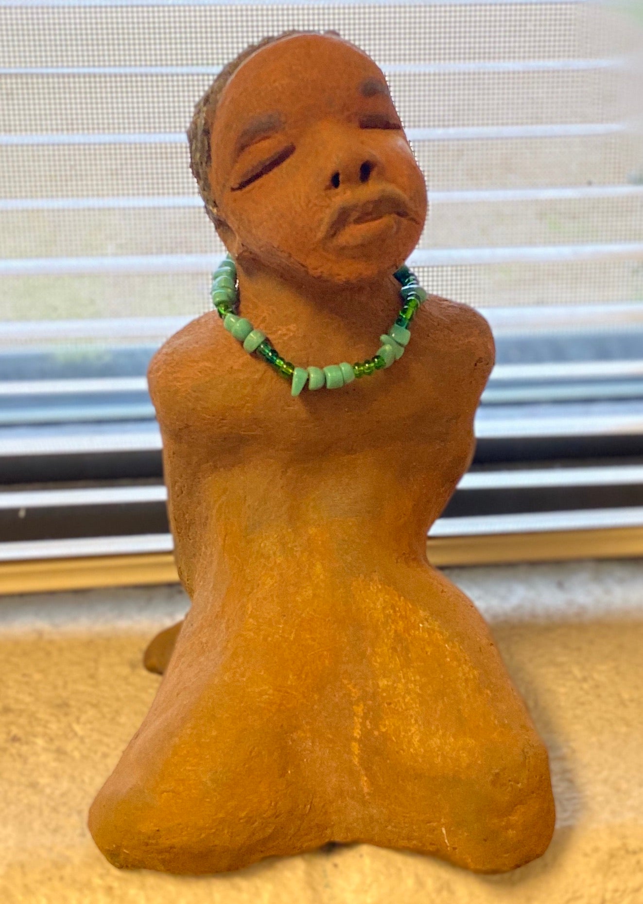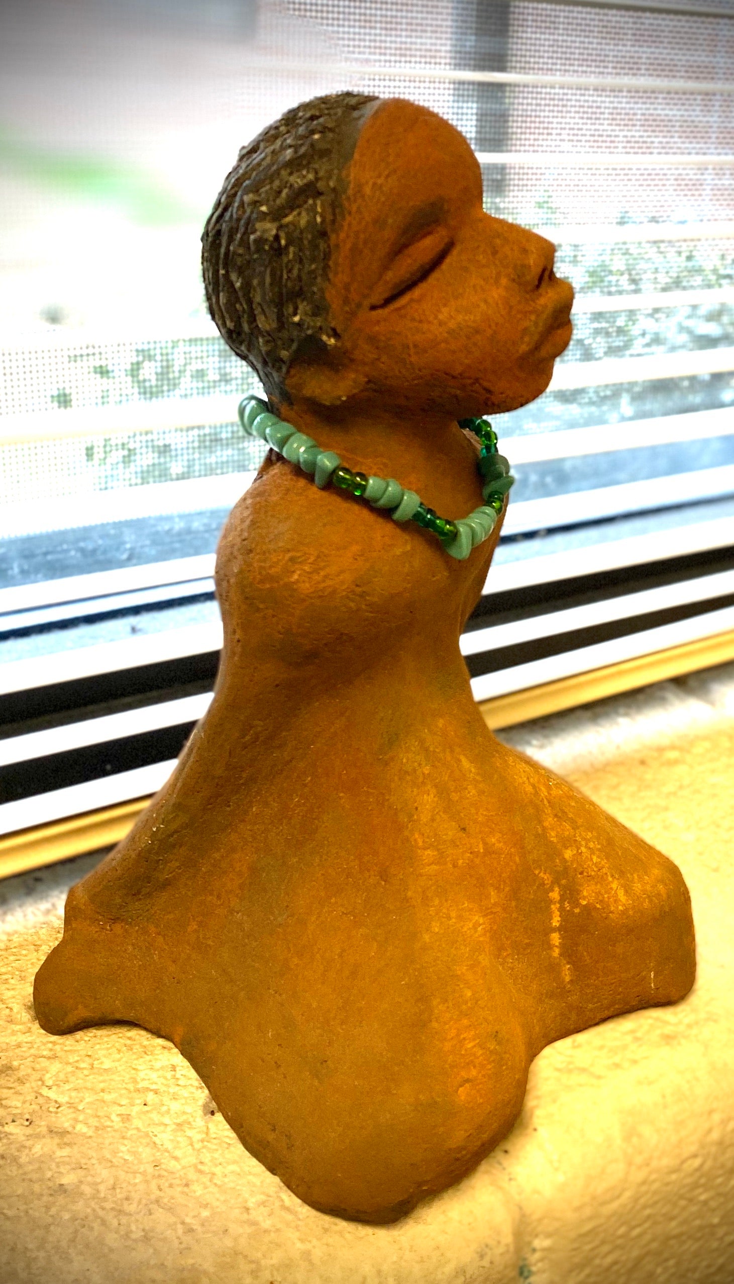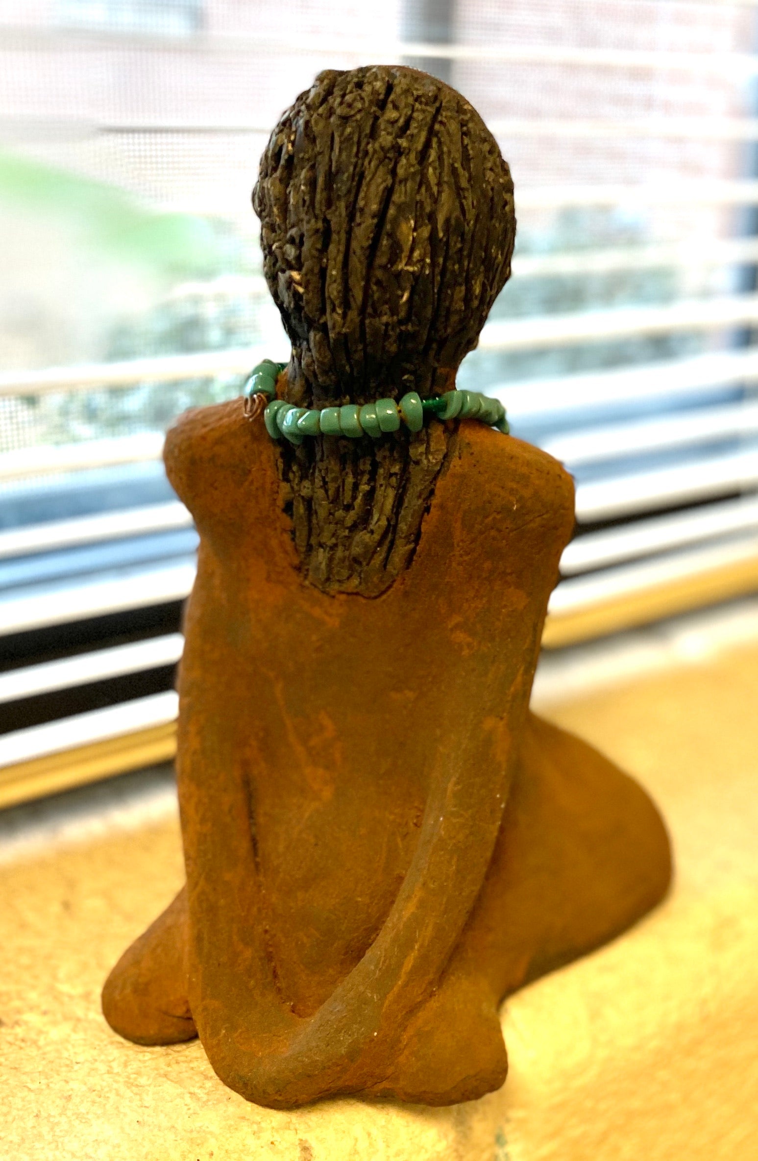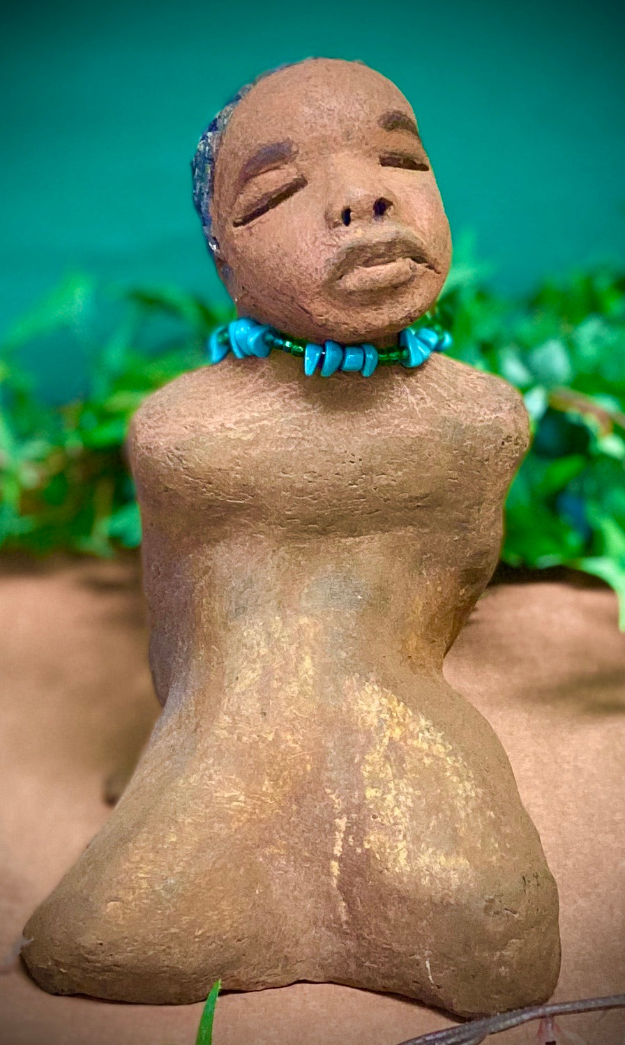 Standing 9" x 5" x 6" and weighing 2.09 lbs, Sahara brings a cocoa complexion, a low charcoal gray hairstyle, and a turquoise tribal beaded necklace to any home. With her eyes slightly open and her hands tucked behind her back, she promises to attract and create conversation with guests. Don't forget - free shipping is included! If you have any questions, reach out and ask!