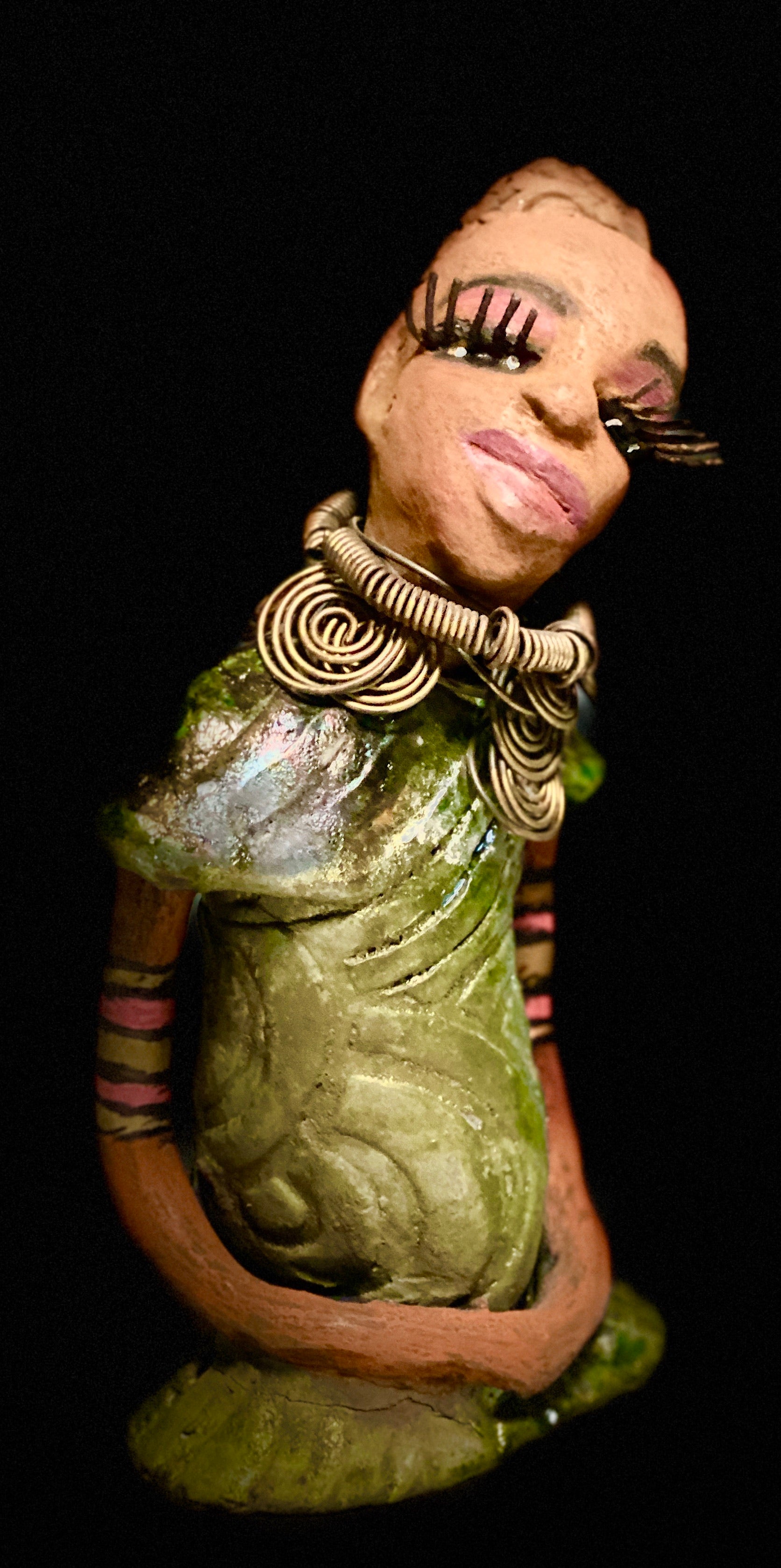- Sonya has a colorful metallic green antique copper glazed dress.