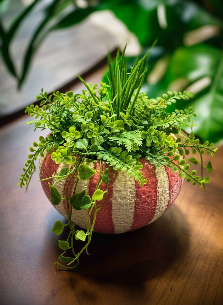 This textured red copper beige strip vase adds a unique touch to any space. With a 4.5 inch height and 6 inch width and depth, this 1 pound and 9-ounce vase is the perfect size for displaying flowers or other decorative items. The glazed interior adds to its natural charm.