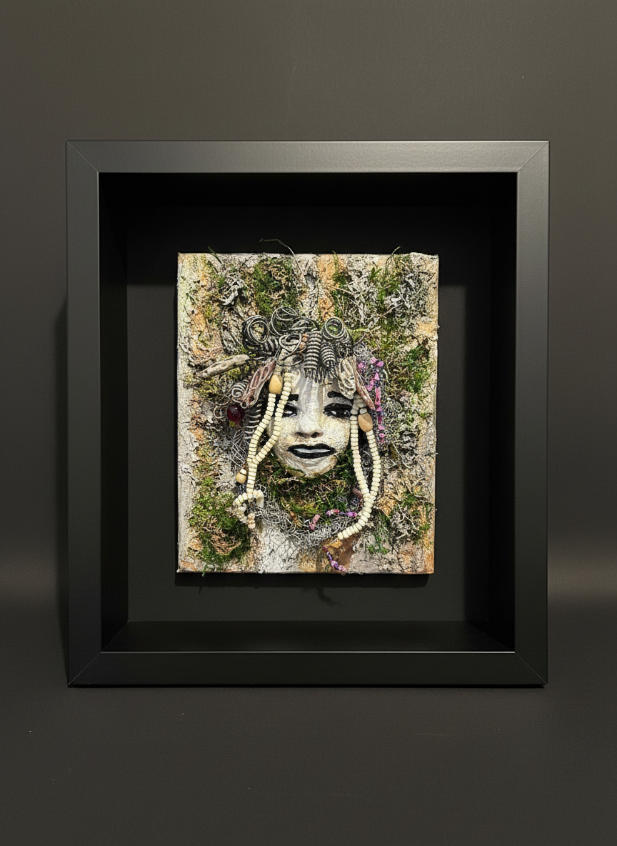 Introducing Mika, the expertly crafted mixed media raku fire mask from HerDew.com. Weighing in at approximately 2 1/2 pounds, this unique mask features a stunning combination of 16 and 24 gauge wire, handmade Raku fired beads, off-white pony beads, and a background design inspired by tree bark. Perfect for beginners looking to start their mask collection. Shadowbox not included.