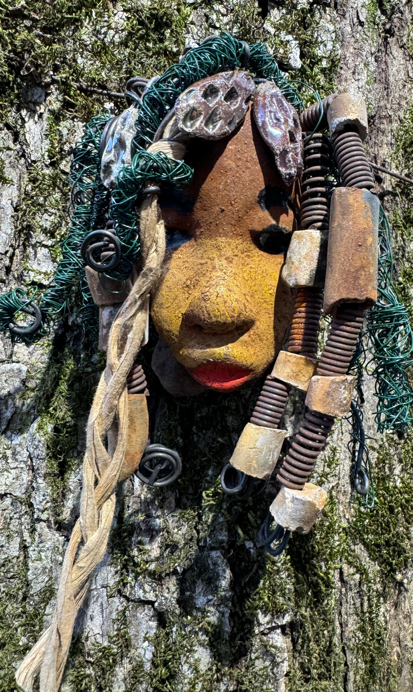 Wanda is an eye-catching 5"x8" Raku-fired mask. With 16 and 24-gauge wire woven for 20ft in length, her two-tone honey-brown complexion is a stunning contrast to her green-coiled locs. This holiday season, make her yours for a reduced price. Start your very own collection or surprise someone special with her! She looks fabulous in a shadow box, on a tree, or just standing alone.